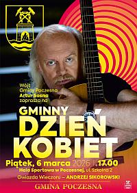 Wójt Gminy Poczesna zaprasza na Gminny Dzień Kobiet, który odbędzie się 6 marca 2026 r. (piątek), o godzinie 17:00, w Hali Sportowej w Poczesnej, ul. Szkolna 2. Gwiazda wieczoru - Andrzej Sikorowski.