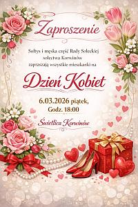 Sołtys i męska część Rady Sołeckiej sołectwa Korwinów serdecznie zapraszają wszystkie Panie - mieszkanki Korwinowa na DZIEŃ KOBIET, który odbędzie się w piątek 06.03.2026 r. o godzinie 18:00 w świetlicy wiejskiej w Korwinowie.